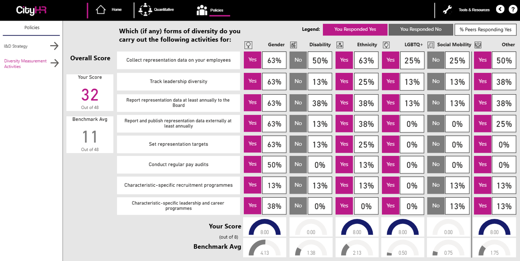 A respondent-locked interactive dashboard developed for the City HR Benchmarking Programme, see samples below.