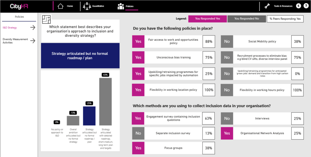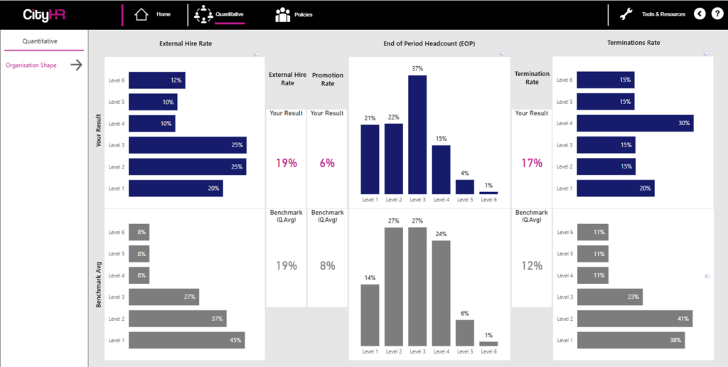 A respondent-locked interactive dashboard developed for the City HR Benchmarking Programme, to be shared with individual participants to access their data and benchmark results
